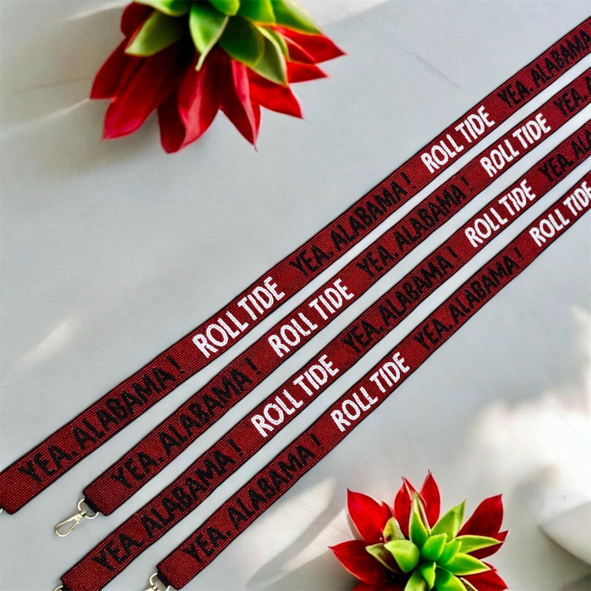 Show your Alabama pride loud and clear with this Handmade Beaded Purse Strap featuring the iconic tagline "Roll Tide Yea, Alabama"! This vibrant strap, crafted with high-quality crimson and white beads, is the perfect way to accessorize for game days, tailgates, or everyday Crimson Tide spirit.