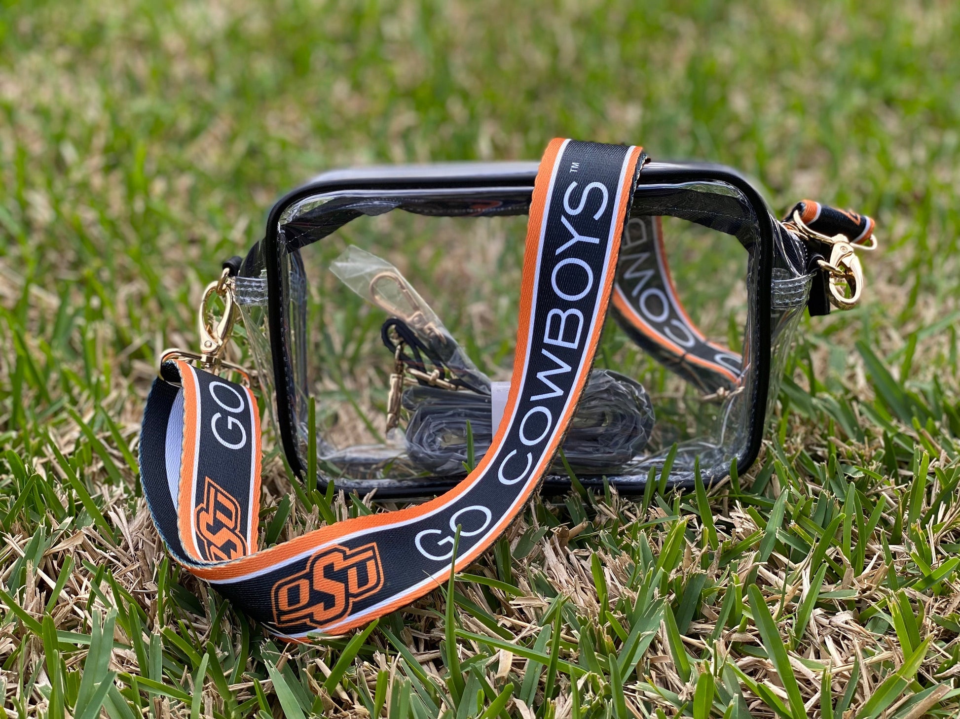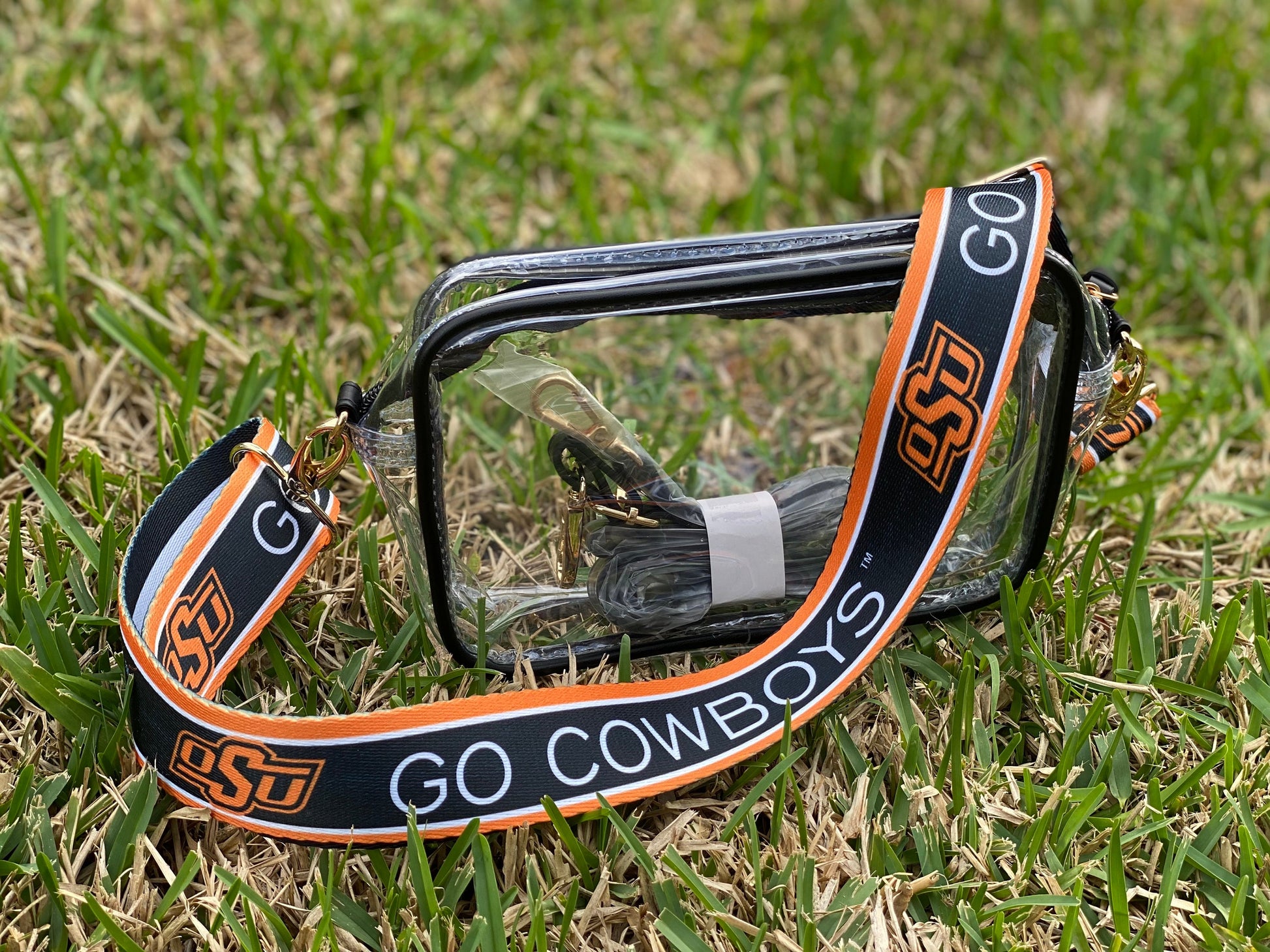 Approved stadium clear purse with Officially Licensed Oklahoma State University Strap.